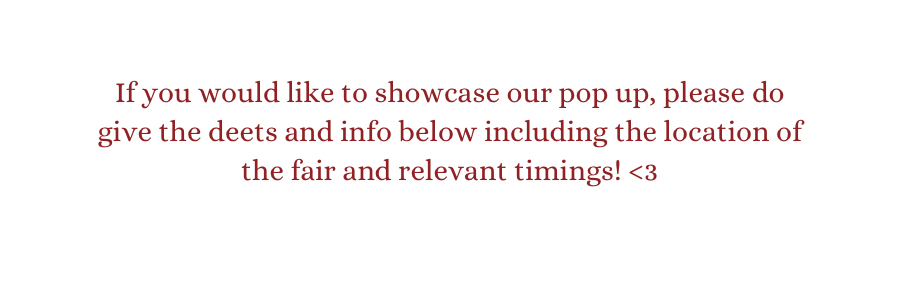 | Date | Pop up Location/Event |